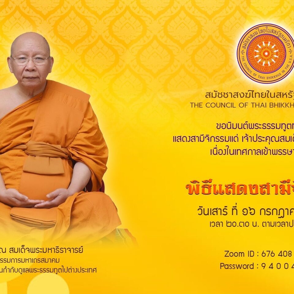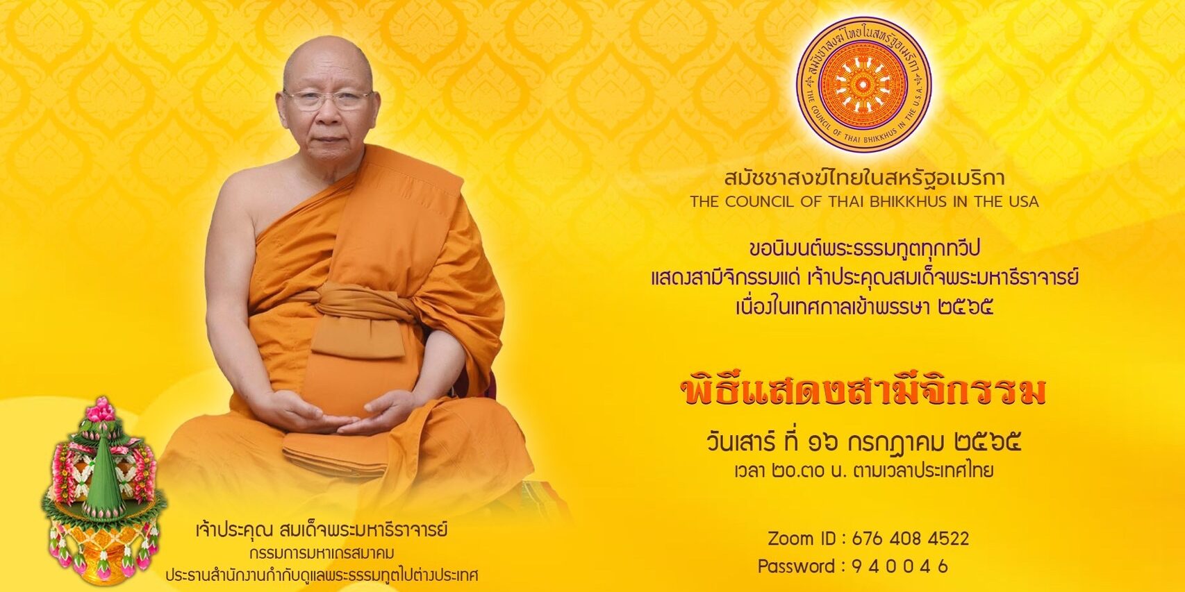 วันเสาร์ที่ ๑๖ กรกฎาคม พุทธศักราช ๒๕๖๕ สมัชชาสงฆ์ไทยในสหรัฐอเมริกาและพระธรรมทูตทั่วโลก ร่วมพิธีสามีจิกรรมแก่พระมหาเถระในเทศกาลเข้าพรรษา