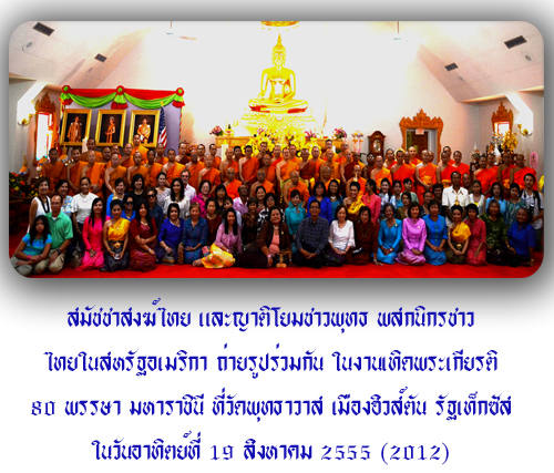 งานเฉลิมพระเกียรติสมเด็จพระนางเจ้าพระบรมราชินีนาถ ทรงเจริญพระชนมพรรษา ครบ 80 พรรษา จัดโดยสมัชชาสงฆ์ไทยในสหรัฐอเมริกา ในวันอาทิตย์ที่ 19 สิงหาคม 2555 …………………………………………………………. ภาพงามๆจาก อะลิตเติ้ลบุ๊ดด่ะ ดอทคอม http://www.alittlebuddha.com/
