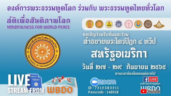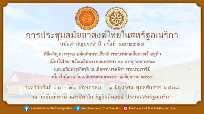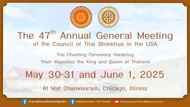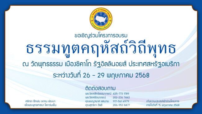 กำหนดการประชุมสมัยสามัญประจำปี องค์กรธรรมทูตคฤหัสถ์วิถีพุทธ ภาคพื้นอเมริกา ณ วัดพุทธธรรม เมืองชิคาโก รัฐอิลลินอยส์ วันที่ ๒๗ – ๒๘ พฤษภาคม ๒๕๖๘ ******* วันอังคารที่ ๒๗ พฤษภาคม ๒๕๖๘ เวลา ๐๖.๐๐ น. ทำวัตรเช้าภาคภาษาอังกฤษ : พระวิเทศสิทธิธรรมาภรณ์ วัดอตัมมยตาราม เวลา ๐๖.๓๐ น. สมาธิภาวนา : พระครูวชิรธรรมวิเทศ วัดพุทธออเรกอน เวลา ๐๗.๑๕ น. ฉันภัตตาหารเช้า เวลา ๐๘.๓๐ น. ลงทะเบียนรับเอกสารการประชุมที่อุโบสถวัดพุทธธรรม เวลา ๐๙.๐๐ น. พิธีเปิดการประชุมองค์กรธรรมทูตคฤหัสถ์วิถีพุทธ ภาคพื้นอเมริกา : พระมหาปิยะ อุตฺตมปญฺโญ และพระมหาสมบัติ อินฺทปญฺโญ พิธีกร – คณะสงฆ์เดินแถวเข้าอุโบสถ (พร้อมเปิดเพลง)…