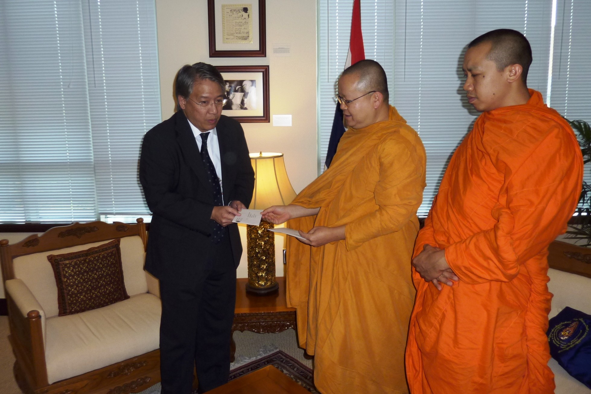 Detailsเมื่อวันที่ ๑๘ ตุลาคม ๕๔ ดร.พระมหาถนัด อตฺถจารี . เลขาธิการ สมัชชาสงฆ์ไทยในสหรัฐอเมริกา ได้เข้าพบ ฯพณฯ กิตติพงษ์ ณ ระนอง เอกอัครราชทูตไทย ประจำสหรัฐอเมริกา มอบเงินจำนวน ๑๐,๐๐๐.๐๐ เหรียญฯ(หนึ่งหมื่นเหรียญฯ)ในนามสมัชชาสงฆ์ไทยฯ เพื่อช่วยเหลือผู้ประสบอุทกภัยที่ประเทศไทย