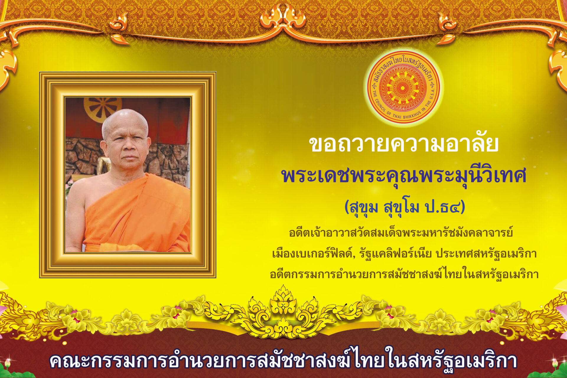 ประกาศแจ้งข่าวการมรณภาพ ของพระมุนีวิเทศ (สุขุม สุขุโม ป.ธ.๔) อดีตเจ้าอาวาสวัดสมเด็จพระมหารัชมังคลาจารย์ เมืองเบเกอร์ฟิลด์, รัฐแคลิฟอร์เนีย ประเทศสหรัฐอเมริกา